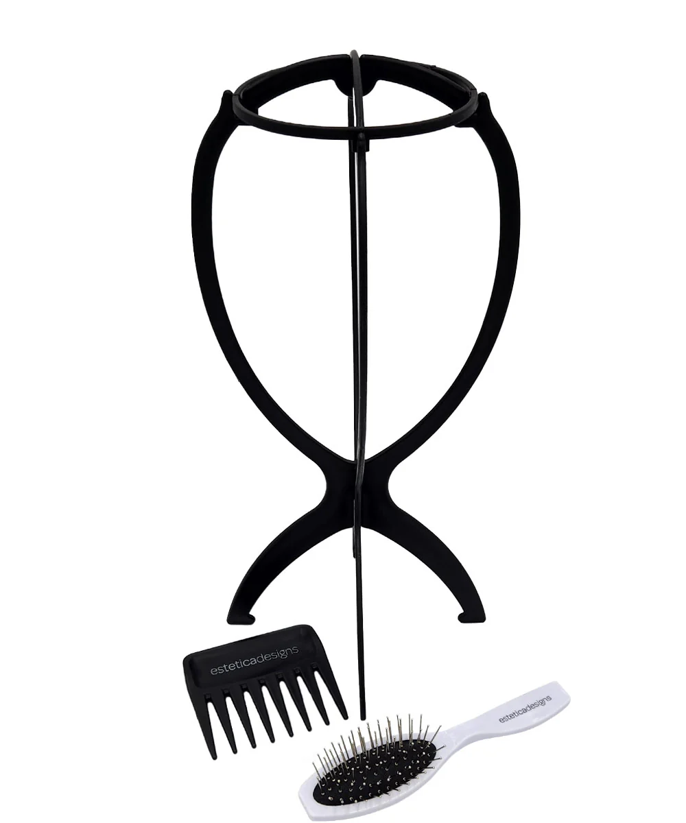 Proper care and maintenance of your wigs and hair pieces is essential to keep them beautiful and lasting longer. This begins with the right tools. The Accessories Trio is a must-have for any wig wearer. The wig stand is easy to assemble and collapsible for storage or travel. The wig brush is made with stainless steel ball tipped bristles for safe and easy styling. The pocket sized wide tooth comb is safe for detangling and quick styling on the go.