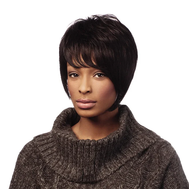 Adorable sweeping bob with gently chopped layers sprinkled along the crown.