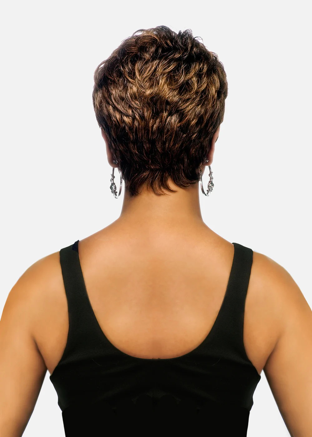 H222-V is an 8 inch layered short pixie style with loose tape curl and tapered back. Carefully selected premium quality human hair and center skin part will make it even more natural and luxurious. Pure stretch cap stretches throughout the entire perimeter inside which lets you wear it comfortably all day long without causing unwanted headache. It is such a versatile style that allows you to wear it to the office, yet you can go with it to Girls’ Night Out to have fun.