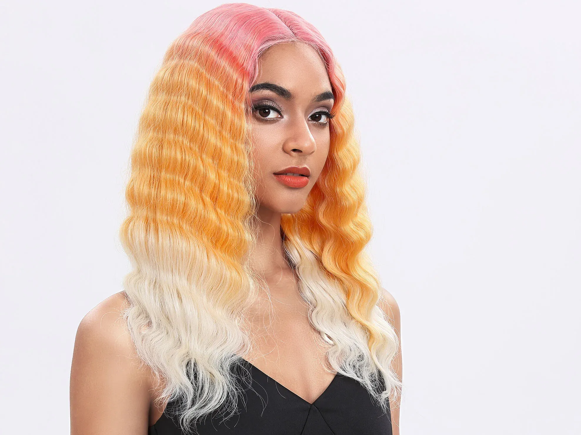 This curly wave style wig, has a 5” deep lace centre parting. Available, in a few colourful ombre and base colours, this lace front wig also features baby hairs and can be heat styled.