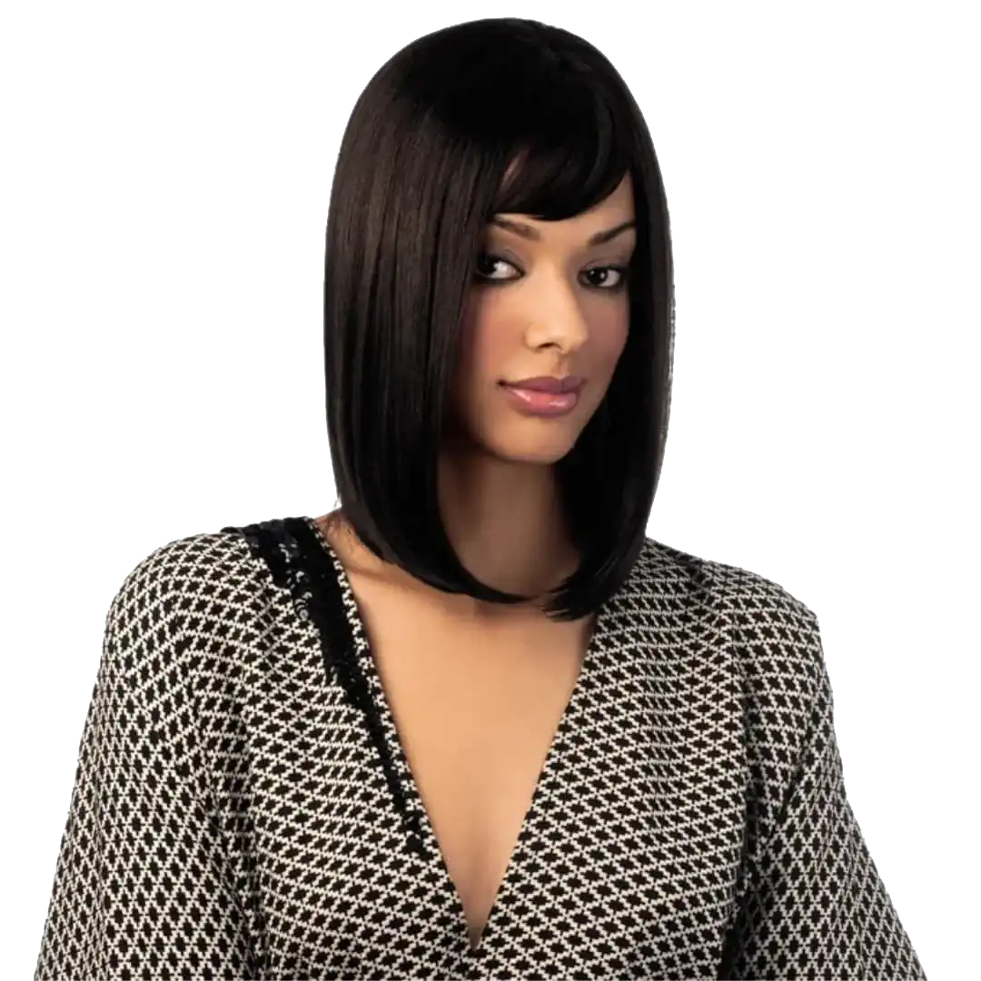 Smooth, silky, shoulder hugging Cleopatra style with a side fringe.